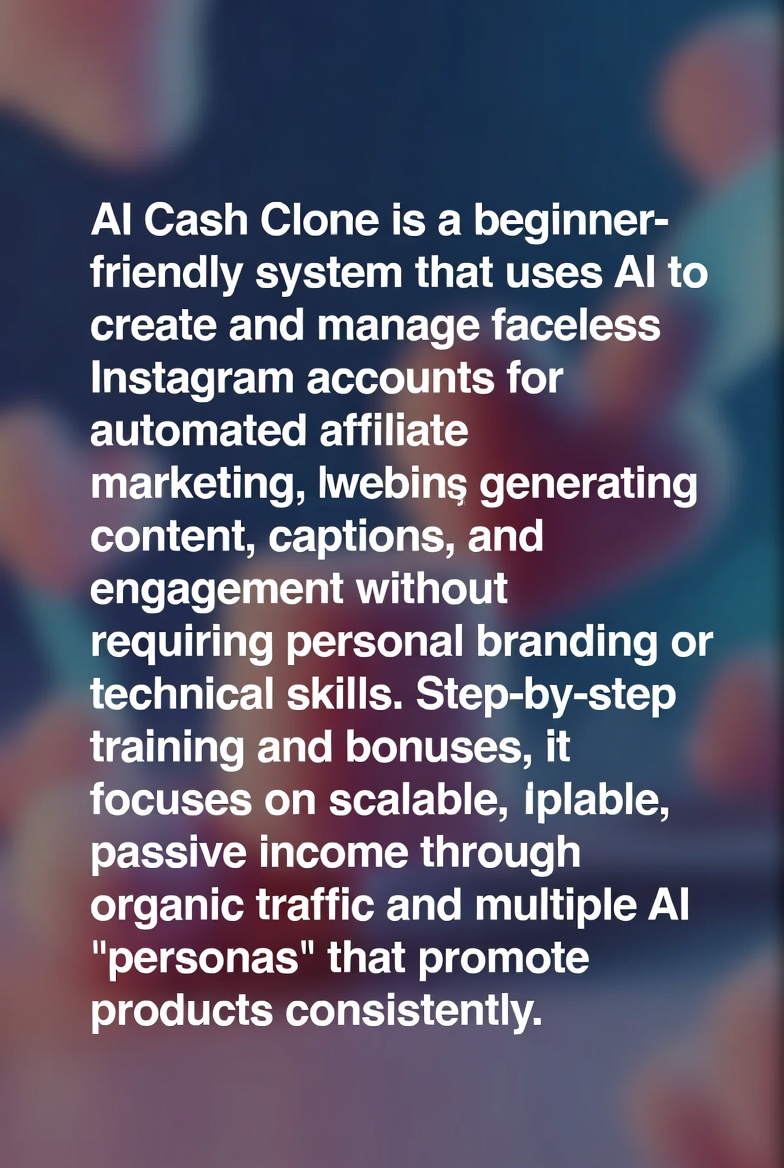 AI Cash Clone is a beginner-friendly system that uses AI to create and manage faceless Instagram accounts for automated affiliate marketing, generating content, captions, and engagement without requiring personal branding or technical skills. Step-by-step training and bonuses, it focuses on scalable, passive income through organic traffic and multiple AI “personas” that promote products consistently.