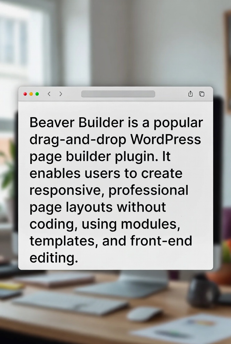 Beaver Builder is a popular drag-and-drop WordPress page builder plugin. It enables users to create responsive, professional page layouts without coding, using modules, templates, and front-end editing.