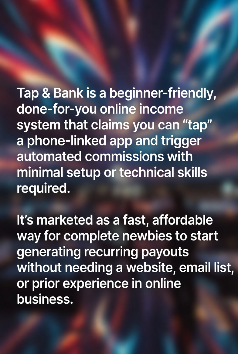 Tap & Bank is a beginner‑friendly, done‑for‑you online income system that claims you can “tap” a phone-linked app and trigger automated commissions with minimal setup or technical skills required. It’s marketed as a fast, affordable way for complete newbies to start generating recurring payouts without needing a website, email list, or prior experience in online business.